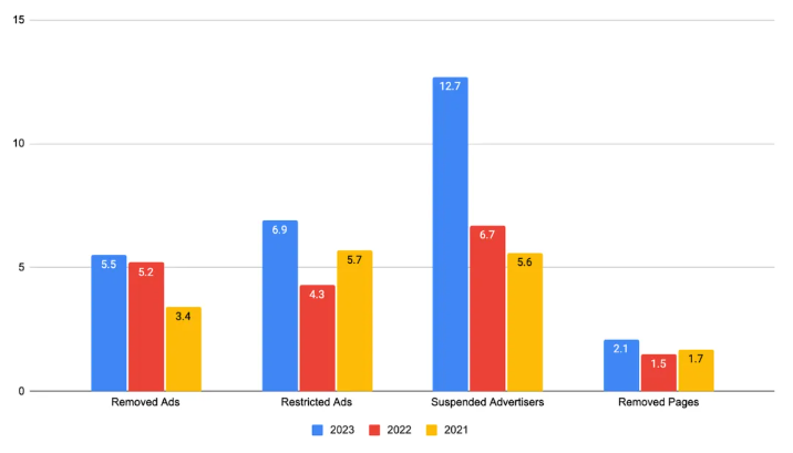 谷歌廣告最近發(fā)布了其2023年度的安全報告,揭示了一些引人注目的數(shù)據(jù)。在這份于3月27日公布的報告中,谷歌透露,他們在2023年成功攔截或移除了55億條違規(guī)廣告,這一數(shù)字較2022年有所上升。更令人矚目的是,他們關(guān)閉了1270萬個涉及欺詐的廣告賬戶,這比2022年的數(shù)目增加了近90%。