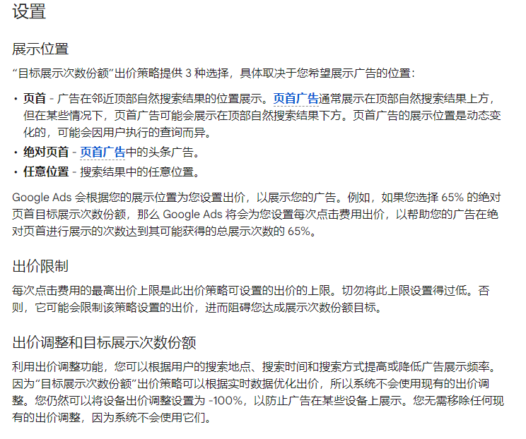 然而,目標展示次數(shù)份額并不適用于所有廣告活動,您應根據(jù)您的廣告活動目標來選擇合適的出價策略。具體的設(shè)置方式應當根據(jù)實際條件來進行調(diào)整,可以調(diào)整的內(nèi)容如以下截圖: