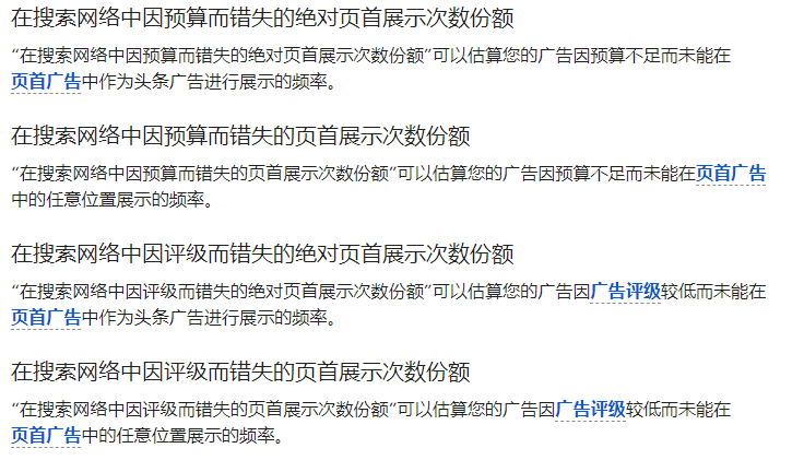 在搜索網(wǎng)絡中獲得的頁首展示次數(shù)份額 = 頁首展示次數(shù)/有資格獲得的頁首展示次數(shù)