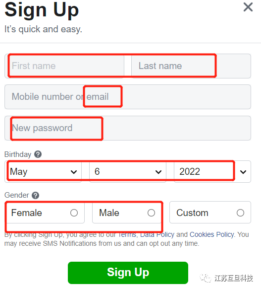 一、打開facebook.com,點擊creat new account, 填寫郵箱密碼注冊信息。幾個注意點: