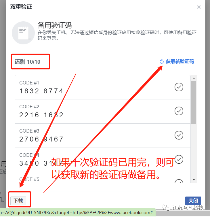 再來說說備用驗證碼,備用驗證碼顧名思義就是別的驗證碼都不管用之后,還可以使用的驗證碼。一次只能生產(chǎn)10個,用完了還要再次生成,打開之后下載保存即可。如果您的手機(jī)丟了,或者第三方驗證器不小心被刪除了,就可以使用這些備用驗證碼登陸FB啦!