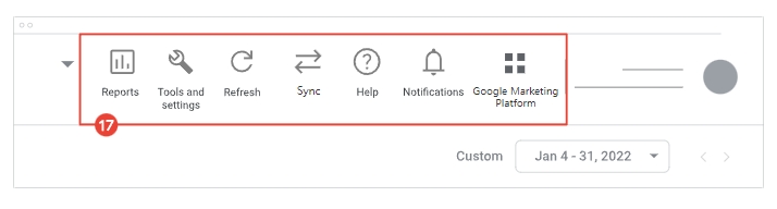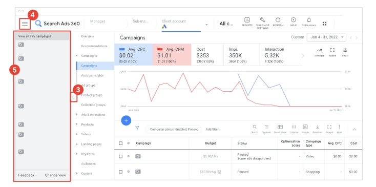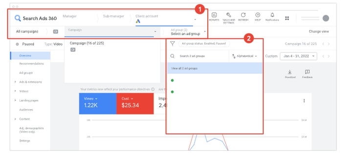 ① 通過導(dǎo)航欄,您可以在 Search Ads 360 賬號層次結(jié)構(gòu)中導(dǎo)航。
