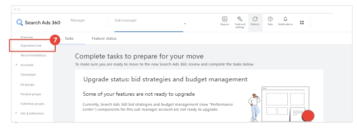 ⑦ 在查看子級經(jīng)理賬號時,可以通過頁面菜單來訪問體驗中心 。通過體驗中心可以及時了解即將推出的功能,以及所有最新的增強(qiáng)功能。