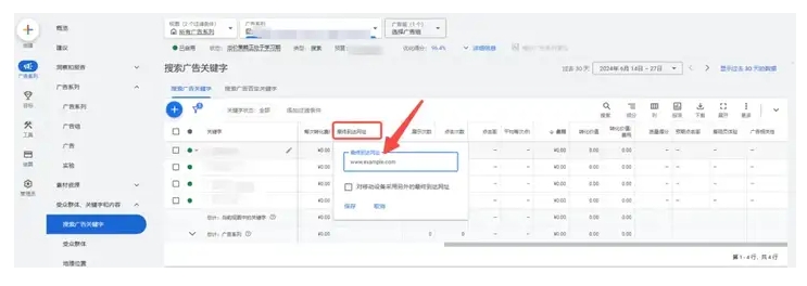 經(jīng)常有用戶提問,是否可以在搜索廣告的關(guān)鍵詞設(shè)置里,為每個不同的關(guān)鍵詞設(shè)置不同的落地頁。今天我們就來分享一下在關(guān)鍵詞層級設(shè)置最終到達(dá)URL(用戶在點擊鏈接或執(zhí)行某個操作后,最終被引導(dǎo)到的目標(biāo)網(wǎng)頁地址。)的方法分享。